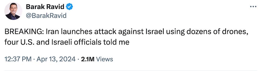 The IDF posted on X: “Iran launched UAVs from within its territory toward Israel a short while ago. The IDF is on high alert and is constantly monitoring the operational situation. The IDF Aerial Defense Array is on high alert, along with IAF fighter jets and Israeli Navy vessels that are on a defense mission in Israeli air and naval space. The IDF is monitoring all targets.”