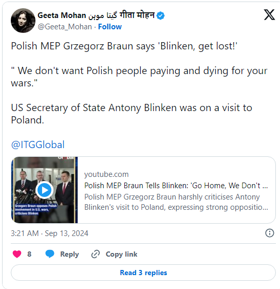 Grzegorz Braun, a Polish member of the European Parliament, recently made a strong statement opposing Poland’s alignment with the United States in the ongoing war in Ukraine. He expressed his dissatisfaction with the U.S. Secretary of State's involvement, stating, "Blinken, go home as soon as possible. Get lost! We don't want you here. We don't want Polish people paying and dying for your wars."